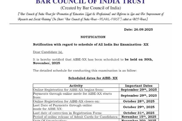 बार काउंसिल ऑफ इंडिया ट्रस्ट ने ऑल इंडिया बार एग्जामिनेशन (AIBE-XX) की तारीखों की घोषणा कर दी है। यह परीक्षा पूरे देश के उन विधि स्नातकों (Law Graduates) के लिए है, जो वकालत के पेशे में कदम रखना चाहते हैं। अधिसूचना के अनुसार यह परीक्षा 30 नवंबर 2025 को आयोजित की जाएगी। 📅 महत्वपूर्ण…