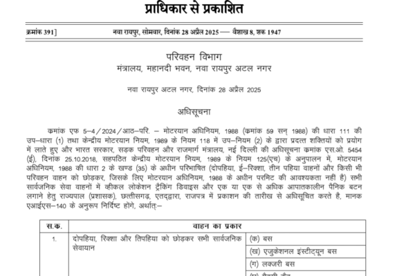 नया रायपुर, 28 अप्रैल 2025 – छत्तीसगढ़ शासन के परिवहन विभाग ने एक महत्वपूर्ण अधिसूचना जारी करते हुए राज्य में चलने वाले सभी सार्वजनिक सेवा वाहनों (दो पहिया, रिक्शा और तीन पहिया को छोड़कर) में वाहन लोकेशन ट्रैकिंग डिवाइस (Vehicle Location Tracking Device – VLTD) और आपातकालीन पैनिक बटन लगाना अनिवार्य कर दिया है।…