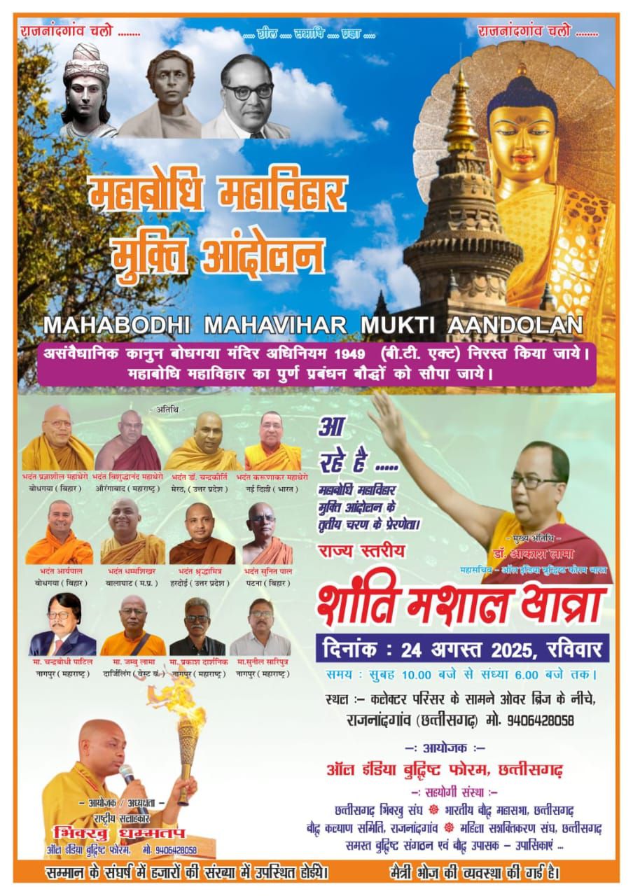 महाबोधि महाविहार बोधगया को बौद्ध समाज को सौंपने और असंवैधानिक बोधगया मंदिर अधिनियम 1949 (बी.टी. एक्ट) को निरस्त करने की मांग को लेकर महाबोधि महाविहार मुक्ति आंदोलन अपने निर्णायक चरण की ओर बढ़ रहा है। इसी क्रम में आंदोलन के तृतीय चरण के प्रणेता डॉ. आकाश लामा के नेतृत्व में प्रदेश स्तरीय शांति मशाल यात्रा का आयोजन आगामी 24 अगस्त 2025, रविवार को राजनांदगांव में किया जा रहा है।