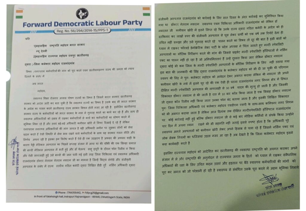 फारवर्ड डेमोक्रेटिक लेबर पार्टी के प्रदेश अध्यक्ष शिव शंकर सिंह ने एनएचएम कर्मचारियों के समर्थन में राज्यपाल और राष्ट्रपति के नाम पत्र लिखा है। उन्होंने पत्र में आरोप लगाया कि छत्तीसगढ़ सरकार स्वास्थ्य विभाग से जुड़े कर्मचारियों की जायज़ मांगों को नजरअंदाज कर रही है, जबकि स्वास्थ्य, शिक्षा, रोजगार, आवास और पोषण राज्यों का विषय है और भारत सरकार पहले ही इस संबंध में आदेश जारी कर चुकी है।