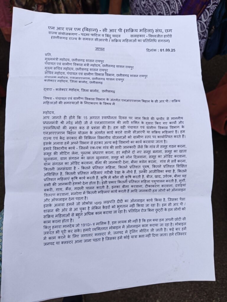 बालोद। (1 सितम्बर 2025) – पंचायत एवं ग्रामीण विकास विभाग के अंतर्गत राष्ट्रीय ग्रामीण आजीविका मिशन (एनआरएलएम – बिहान) से जुड़ी सक्रिय महिला (सीआरपी) कार्यकर्ताओं ने सोमवार को कलेक्टर कार्यालय पहुंचकर अपनी समस्याओं और मांगों को लेकर जिला प्रशासन को ज्ञापन सौंपा।