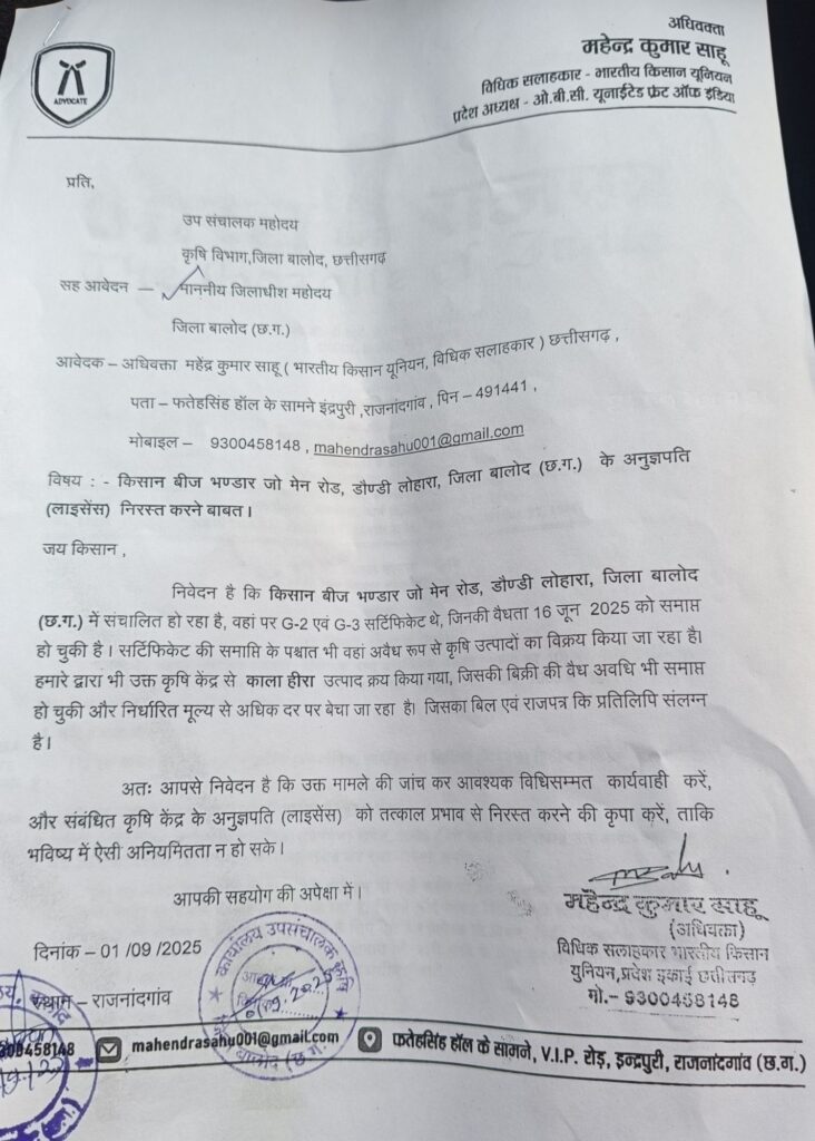 किसानों के हितों की रक्षा और खाद की गुणवत्ता सुनिश्चित करने को लेकर एक बड़ा मामला सामने आया है। छत्तीसगढ़ के बालोद जिले के डोंडी-लोहारा क्षेत्र में किसान बीज भण्डार द्वारा बिना वैध लाइसेंस के उर्वरक बिक्री का आरोप लगा है। इस संबंध में अधिवक्ता महेन्द्र कुमार साहू, जो भारतीय किसान यूनियन के विधिक सलाहकार भी हैं, ने कृषि विभाग को पत्र लिखकर तत्काल प्रभाव से कार्रवाई की मांग की है।