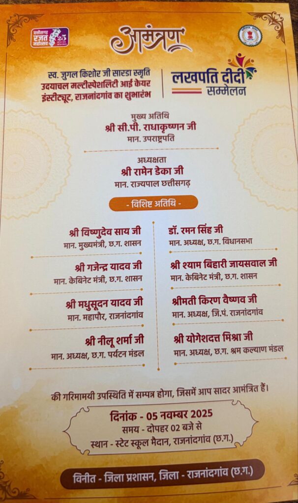 जिले में आयोजित होने जा रहे “लखपति दीदी सम्मेलन” और “स्व. जगल किशोर जी साहू स्मृति उदयाचल मल्टीस्पेशलिटी आई केयर इंस्टिट्यूट” के शुभारंभ कार्यक्रम ने अब राजनीतिक रंग ले लिया है। यह आयोजन 5 नवम्बर 2025 को दोपहर 2 बजे से स्टेट स्कूल मैदान, राजनांदगांव (छ.ग.) में होने जा रहा है, जिसमें देश के माननीय उपराष्ट्रपति श्री सी.पी. राधाकृष्णन जी मुख्य अतिथि के रूप में उपस्थित रहेंगे। कार्यक्रम की अध्यक्षता माननीय राज्यपाल श्री रामेन डेका जी द्वारा की जाएगी।