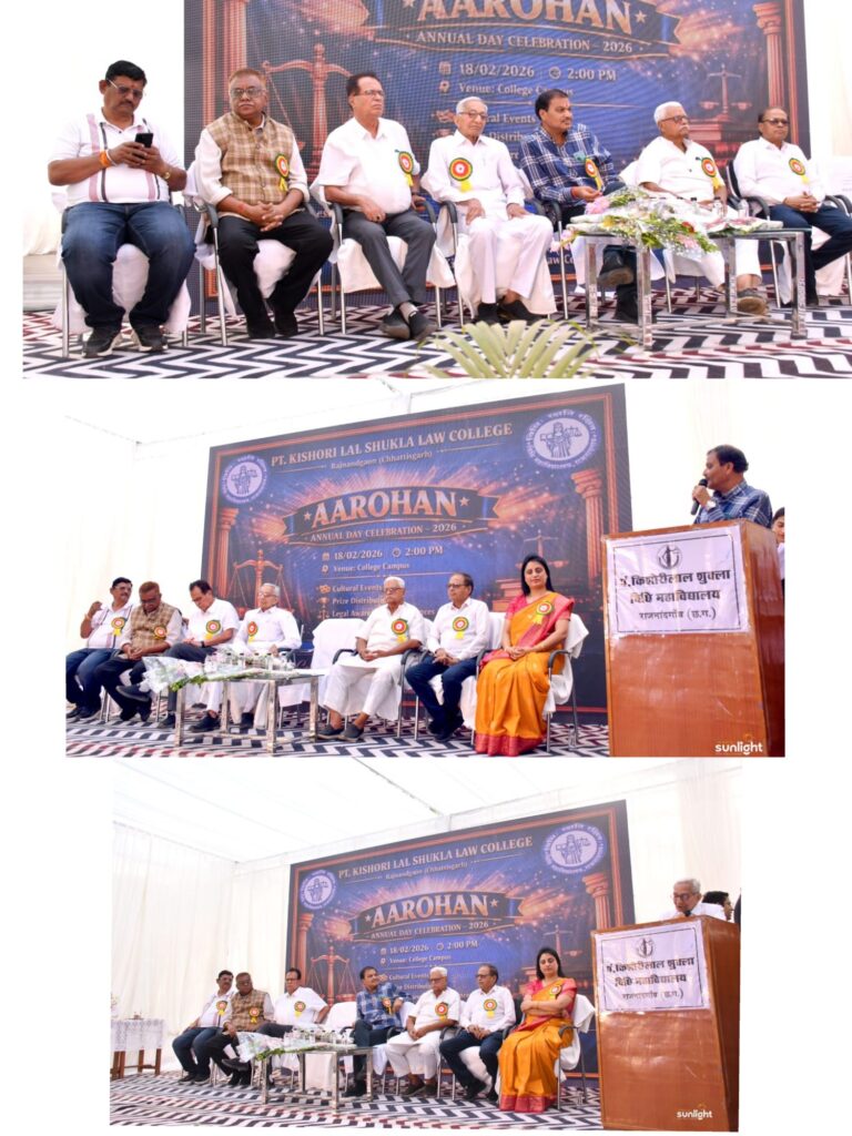 राजनांदगांव। पं. किशोरीलाल शुक्ल विधि महाविद्यालय, राजनांदगांव में 18 फरवरी 2026 को आयोजित वार्षिक समारोह “आरोहण–2026” गरिमा, उत्साह और प्रेरणा का अनूठा संगम बनकर सामने आया। पूरे सत्र में शिक्षा, खेल और सांस्कृतिक गतिविधियों में उल्लेखनीय उपलब्धि हासिल करने वाले विद्यार्थियों को सम्मानित करने के उद्देश्य से आयोजित इस समारोह में महाविद्यालय परिवार, अभिभावकों और गणमान्य नागरिकों की उपस्थिति ने कार्यक्रम को विशेष बना दिया।