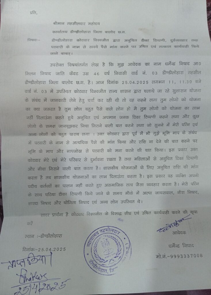 डौंडी लोहारा (बालोद)। डौंडी लोहारा के वार्ड नंबर 3 निवासी धर्मेन्द्र निषाद ने तहसीलदार को एक लिखित आवेदन सौंपकर कोटवार विश्वजीत द्वारा की गई अभद्र टिप्पणी और दुर्व्यवहार के खिलाफ शिकायत दर्ज कराई है। शिकायतकर्ता का आरोप है कि 25 अप्रैल 2025 को राज्य शासन द्वारा संचालित सुशासन योजना की जानकारी लेने के दौरान कोटवार ने उन्हें अपमानजनक बातें कही।