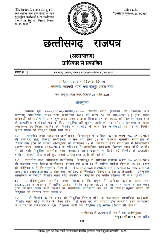 🔹 अधिसूचना में यह भी स्पष्ट किया गया है कि यह नियुक्ति छत्तीसगढ़ किशोर न्याय (बालकों की देखरेख और संरक्षण) नियम, 2021 के अंतर्गत होगी।